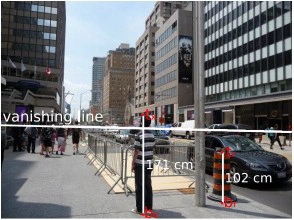 In this paper, we describe how an effective vanishing point detector can be applied to photogrammetry when only a single view of an architectural environment is available. Our method performs automatic segment clustering in projective space - a direct transformation from the image space - instead of the traditional bounded accumulator space. Experiments on real images show the effectiveness of the proposed detector in finding all vanishing points, as well as its application in a photogrammetry algorithm, by recovering the vertical direction of the scene and the vanishing line for the ground plane.
